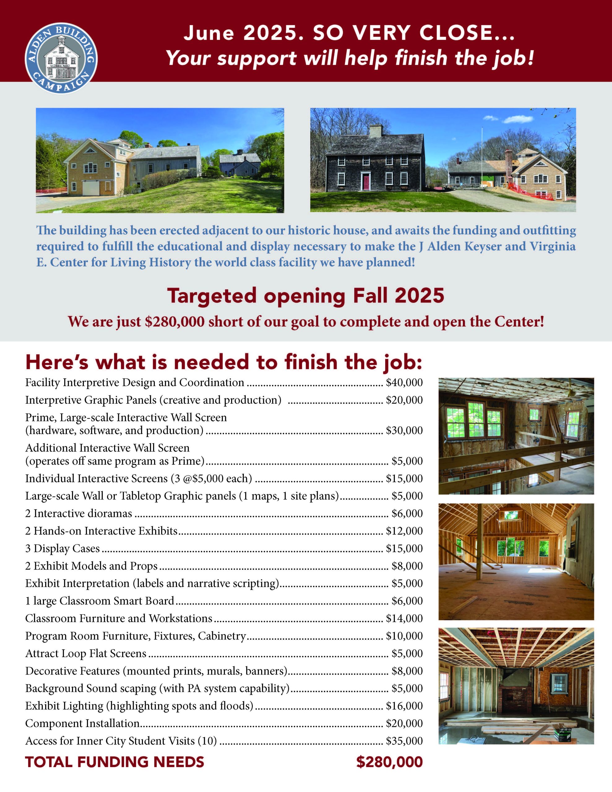 The J. Alden & Virginia E. Keyser Center for Living History is nearly complete! Thanks to the incredible generosity of our community, we’ve raised $1.52 million toward this transformative project. Now, we’re in the home stretch—with just $280,000 left to raise to finish the interior and bring our interactive, educational exhibits to life.